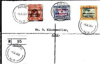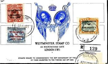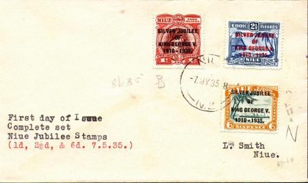 NE1411==> FDC 1935 -- SC67-69var (SG69a-71a) -- Unique Silver Jubilee Cover -- varieties on FDC to include Narrow "K" in King & "N" in King on internal island mail cover -- Niue Addressee -- Rare -- (Isn't nice to live on an island where only your name is needed for delivery!!!) -- VF -- SG £141=$240. ** Your Cost=> $95.00