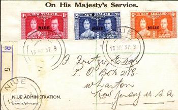 SOLD==> FDC 1937 -- SC 70-2 (SG 72-4) -- Cacheted FDC of Coronation Issue, Clean -- Registered cover to New Zealand. 1418 FDC 1937 -- SC 70-2 (SG 72-4) -- FDC on Niue Postal Admin.. Stationary of Coronation Issue -- to USA via Seattle & Wharton, NJ -- CDS 5Jul37.** Your Cost=> Sold @ $7.50